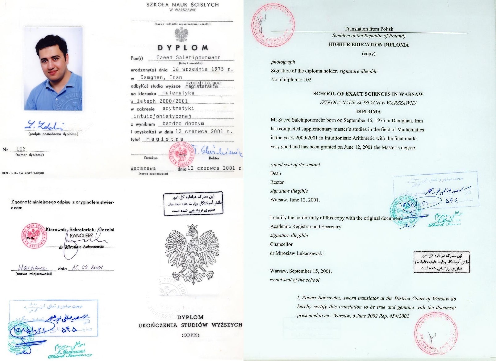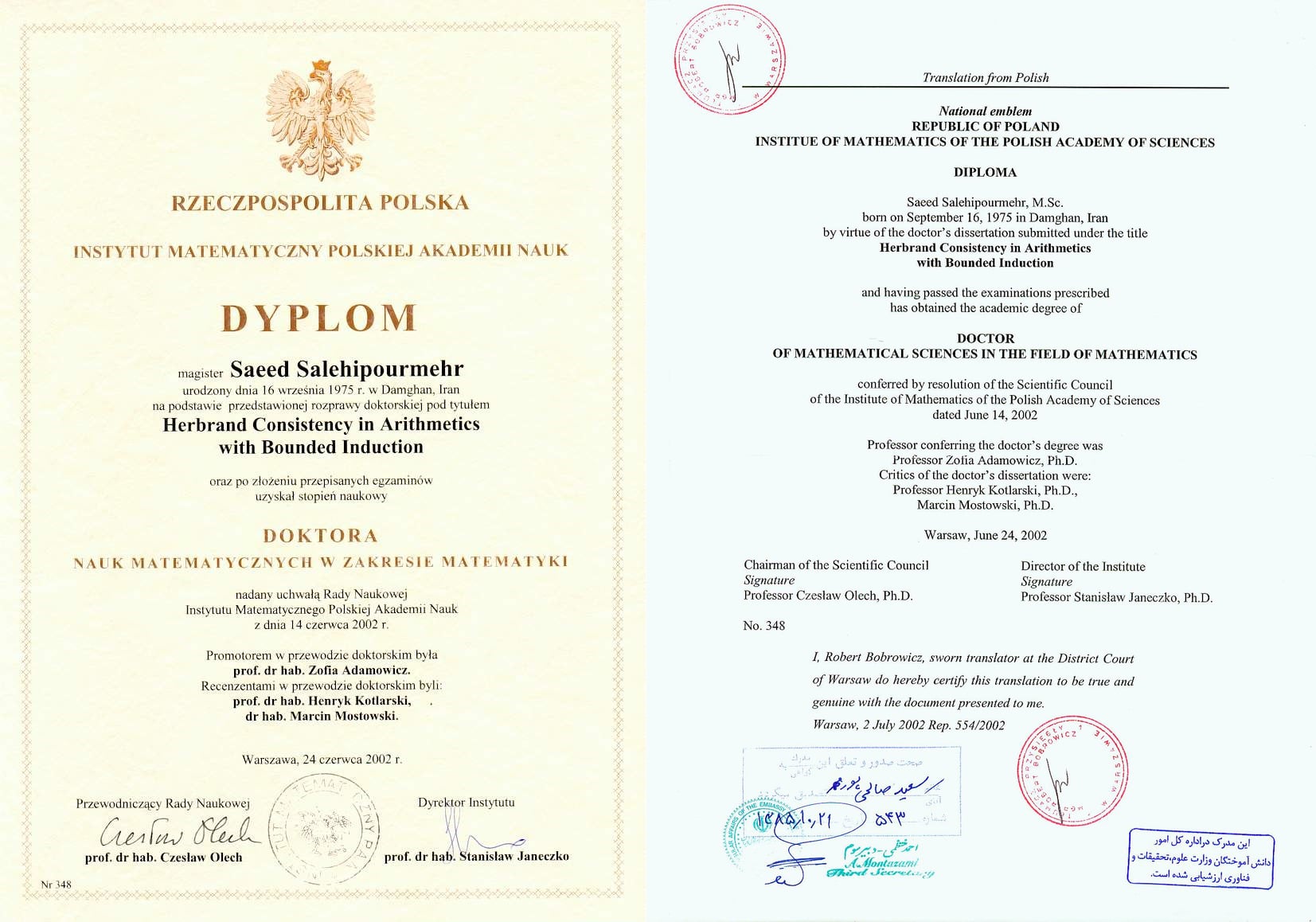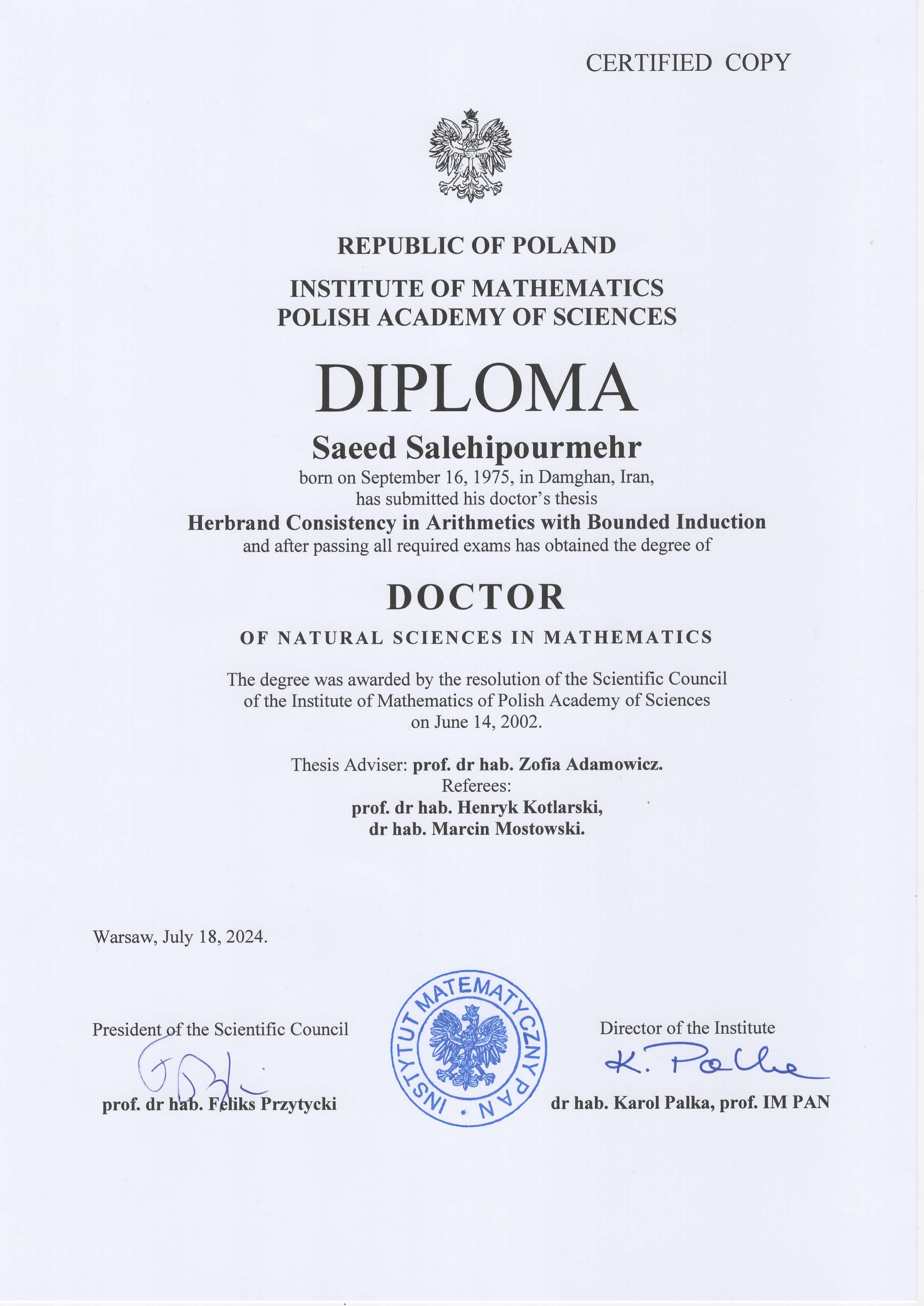 Mathematical Logic, from Polish Academy of Sciences (PAN), Warsaw, Poland (2002), under the supervision of